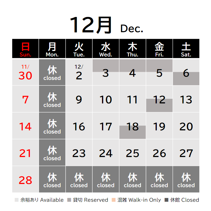 三条鍛冶道場は毎週月曜が休館日です。年末年始は12月29(月)から1月3日(土)まで休館し、4日(日)から再開します。